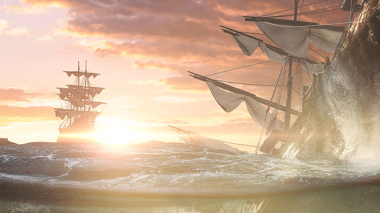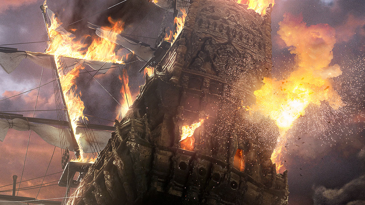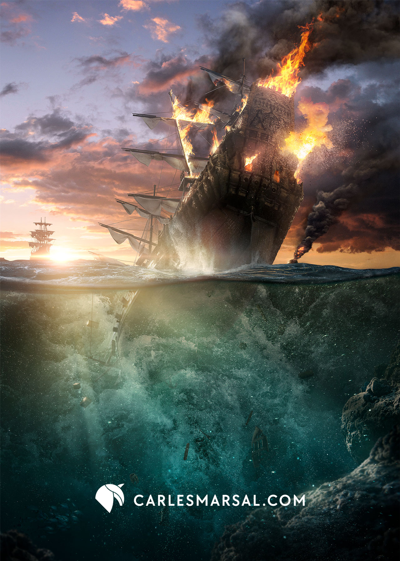 "Galleon Battle" es un proyecto con trasfondo histórico, en el que podemos ver un enorme galeón del siglo XVII justo cuando empieza a hundirse tras ser abatido. Detrás hay un minucioso trabajo de composición, retoque y fotomontaje, especialmente para las texturas, el agua, el fuego y la ambientación. El resultado es una imagen dividida entre lo que ocurre en la superficie y lo que se precipita, de forma inevitable, bajo ella.