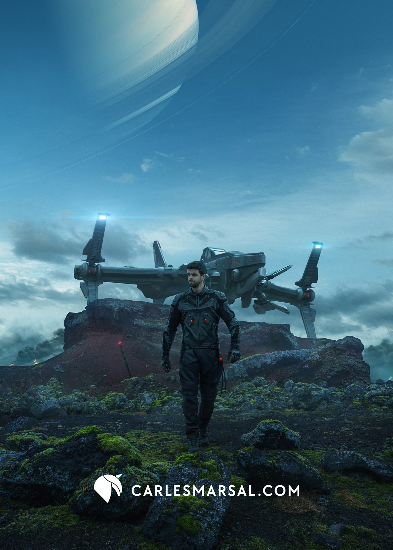 "Morrigan's Frontier" es un proyecto de ciencia ficción en el que el protagonista y la nave se llevan la mayor parte del trabajo. Mediante técnicas de 3D, fotomontaje e ilustración, se crea un diseño con el equilibrio justo entre futurista y real, otorgando credibilidad al conjunto. La dominante azul verdosa y la iluminación blanda y oscura, ensalzan la personalidad bélica y misteriosa de la composición.